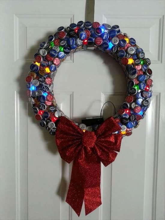 Criar guirlandas de Natal também é outra maneira maravilhosa de reaproveitar as tampinhas de refrigerante de forma criativa. Eventualmente você pode fazer estes enfeites e decorar tudo com muito capricho.