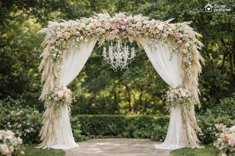Já um casamento clássico e elegante pode optar por estruturas mais elaboradas em ferro forjado, adornadas com arranjos florais sofisticados em tons brancos e cremes, complementados por tecidos esvoaçantes e cristais.